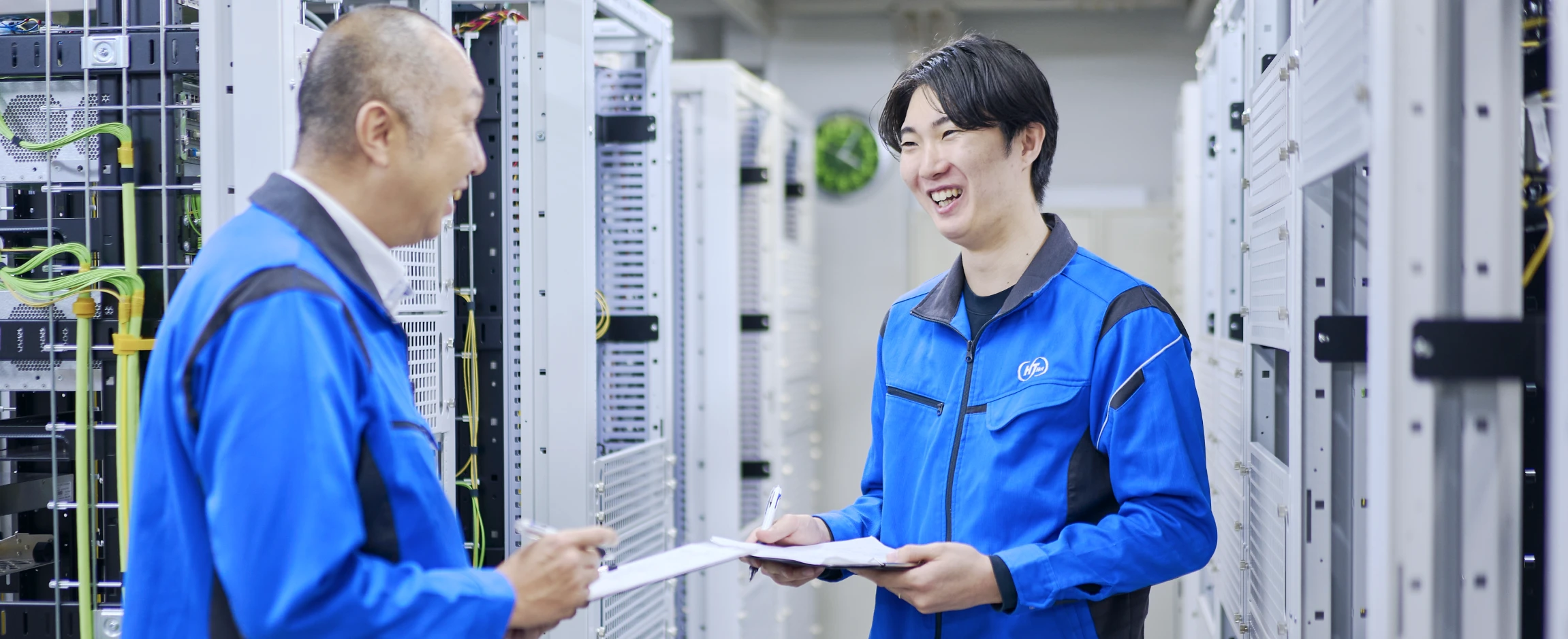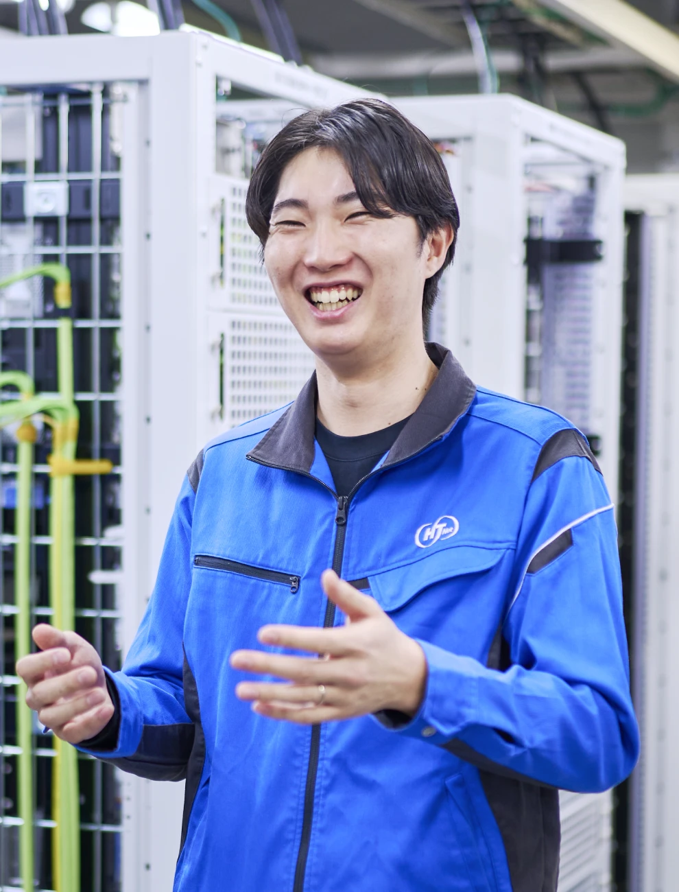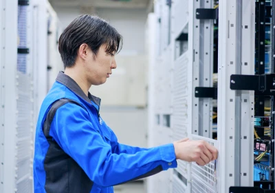 私が所属する技術部 設備グループでは、通信局舎内の設備保守やネットワークの設計・構築、ハウジングサービスの工事など、通信インフラを支える幅広い業務を担当しています。空調・消火設備や通信機器に障害が発生した際は、できるだけ早く復旧できるよう迅速に対応します。現在は主に金沢市内のネットワーク設計や構築を担当し、新しいケーブル導入の検証や旧設備の撤去調整など、環境整備にも取り組んでいます。